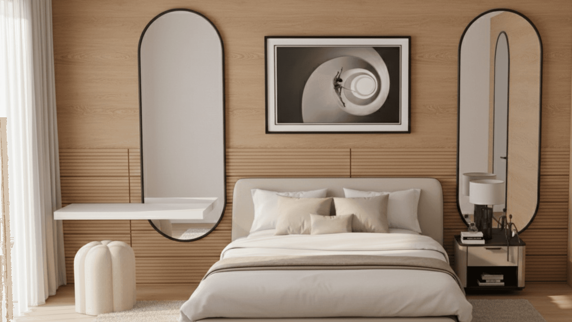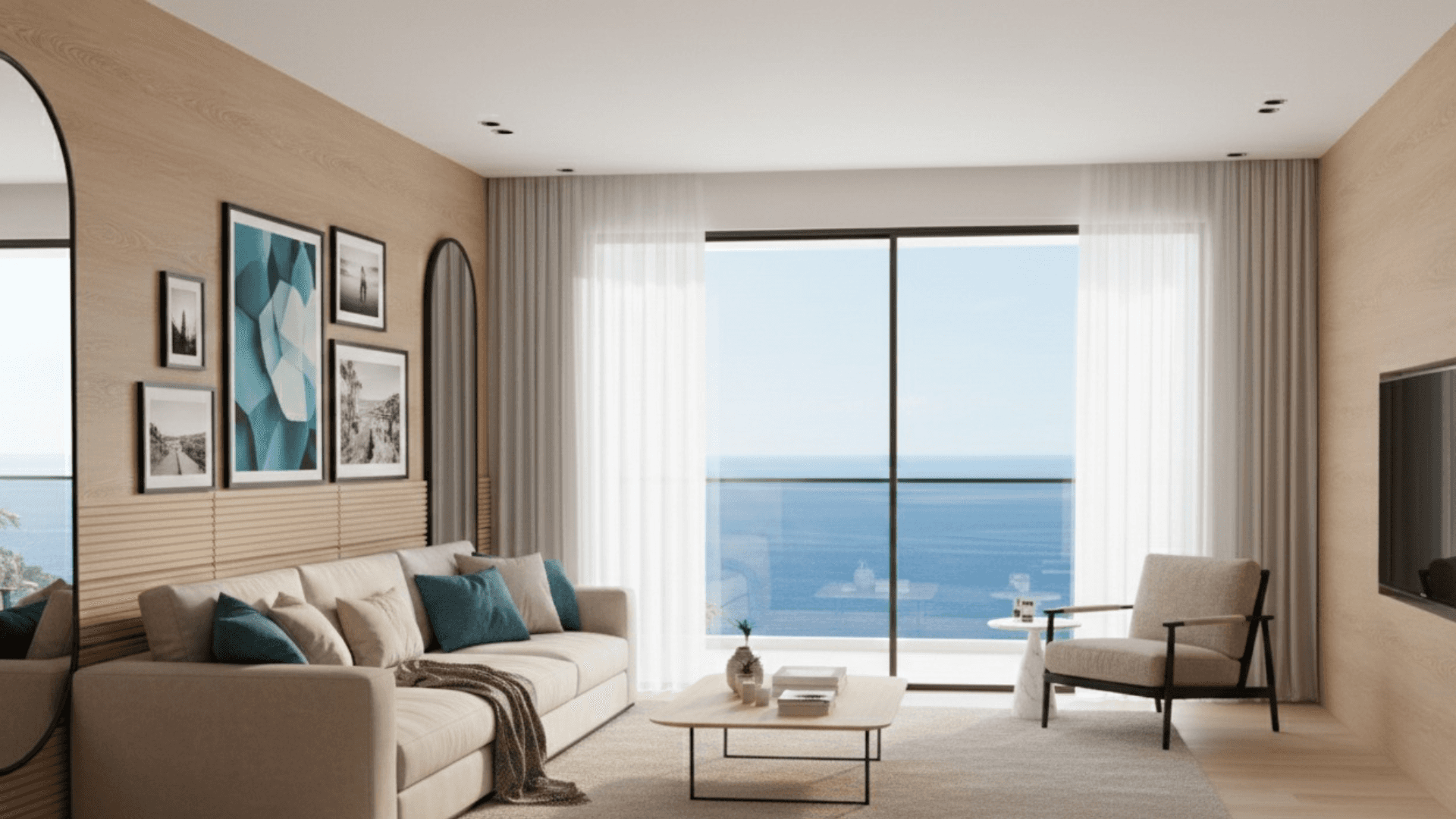 Apartament na Costa del Sol o powierzchni 125 metrów kwadratowych to codzienna baza dla rodziny z nastoletnim dzieckiem. Ciepłe beże i jasne drewno łączą się z akcentami morskiego błękitu, budując wnętrze spokojne i pełne charakteru. Otwarta kuchnia z marmurową wyspą przechodzi w salon z narożną sofą i galerią obrazów, a panoramiczne przeszklenia otwierają każde pomieszczenie na widok morza. Przestronny taras z leżakami i stołem jadalnym pod żaglem przeciwsłonecznym działa jako przedłużenie strefy dziennej. Sypialnia z drewnianą ścianą lamelową i owalnymi lustrami zachowuje hotelowy spokój. Proste formy, naturalne materiały i przemyślany detal pozwalają rodzinie żyć swobodnie między wnętrzem a tarasem.